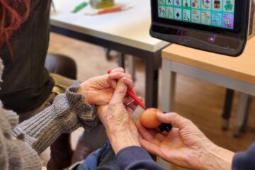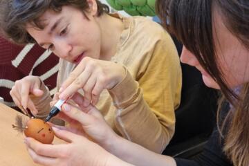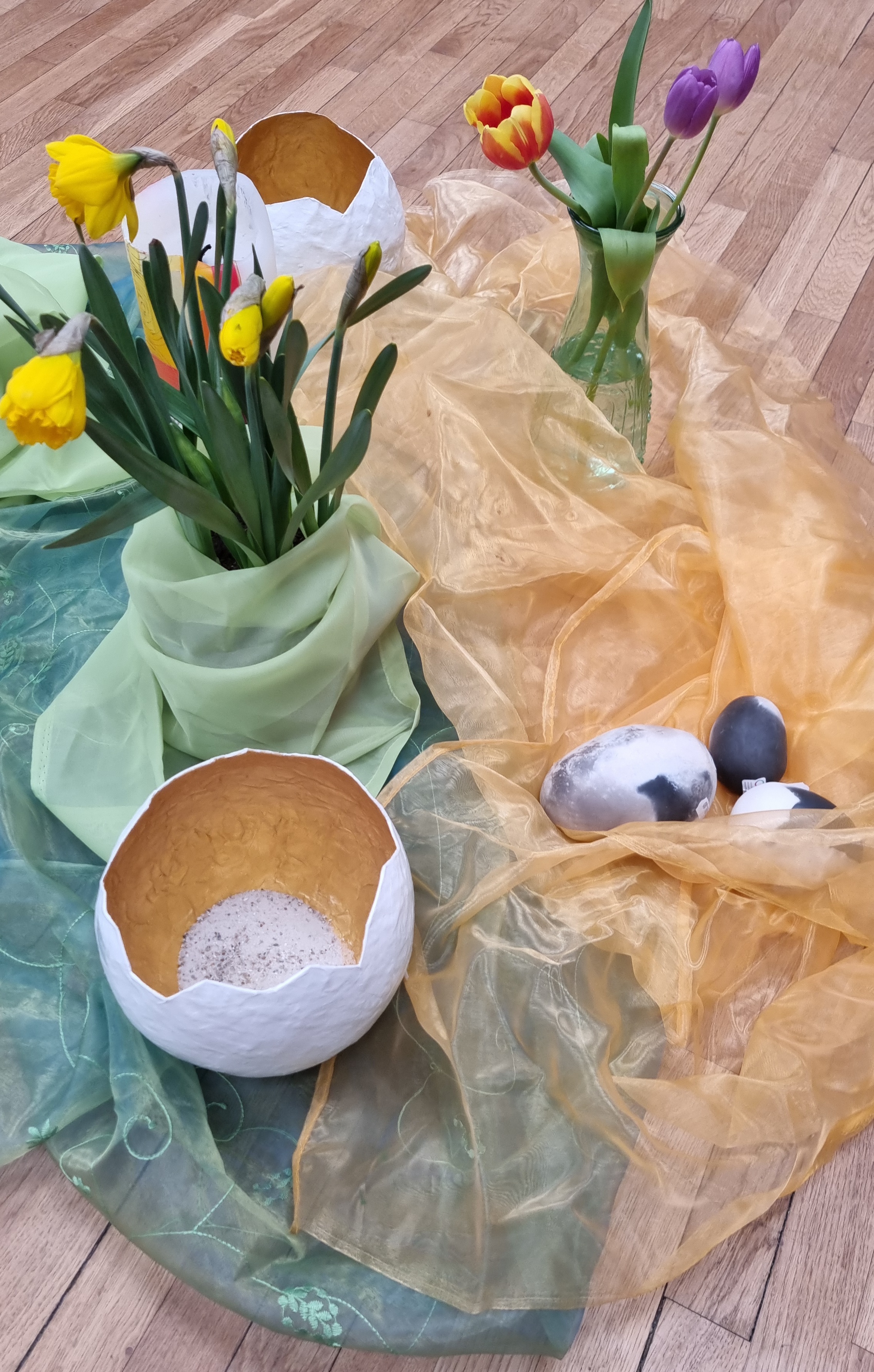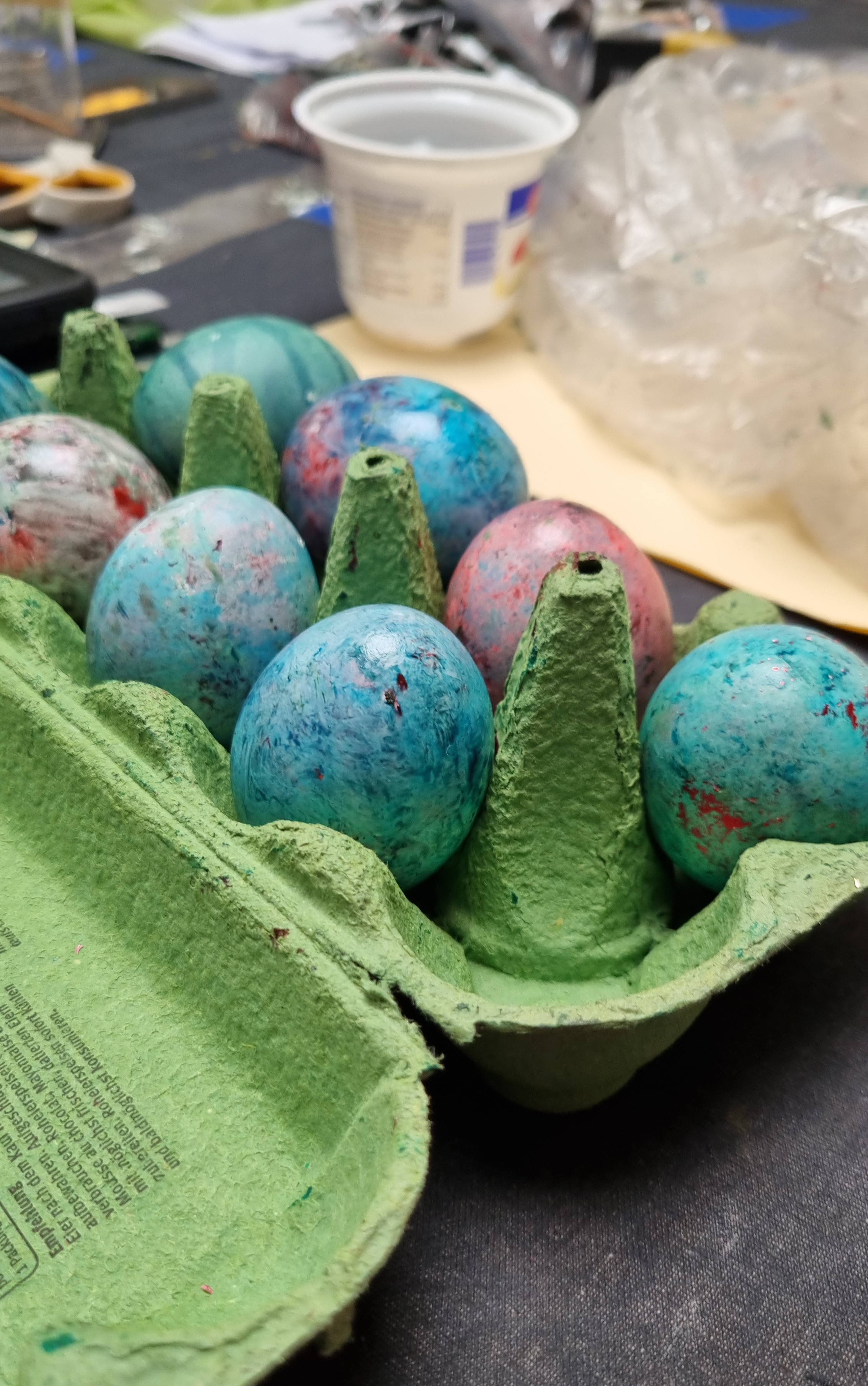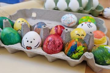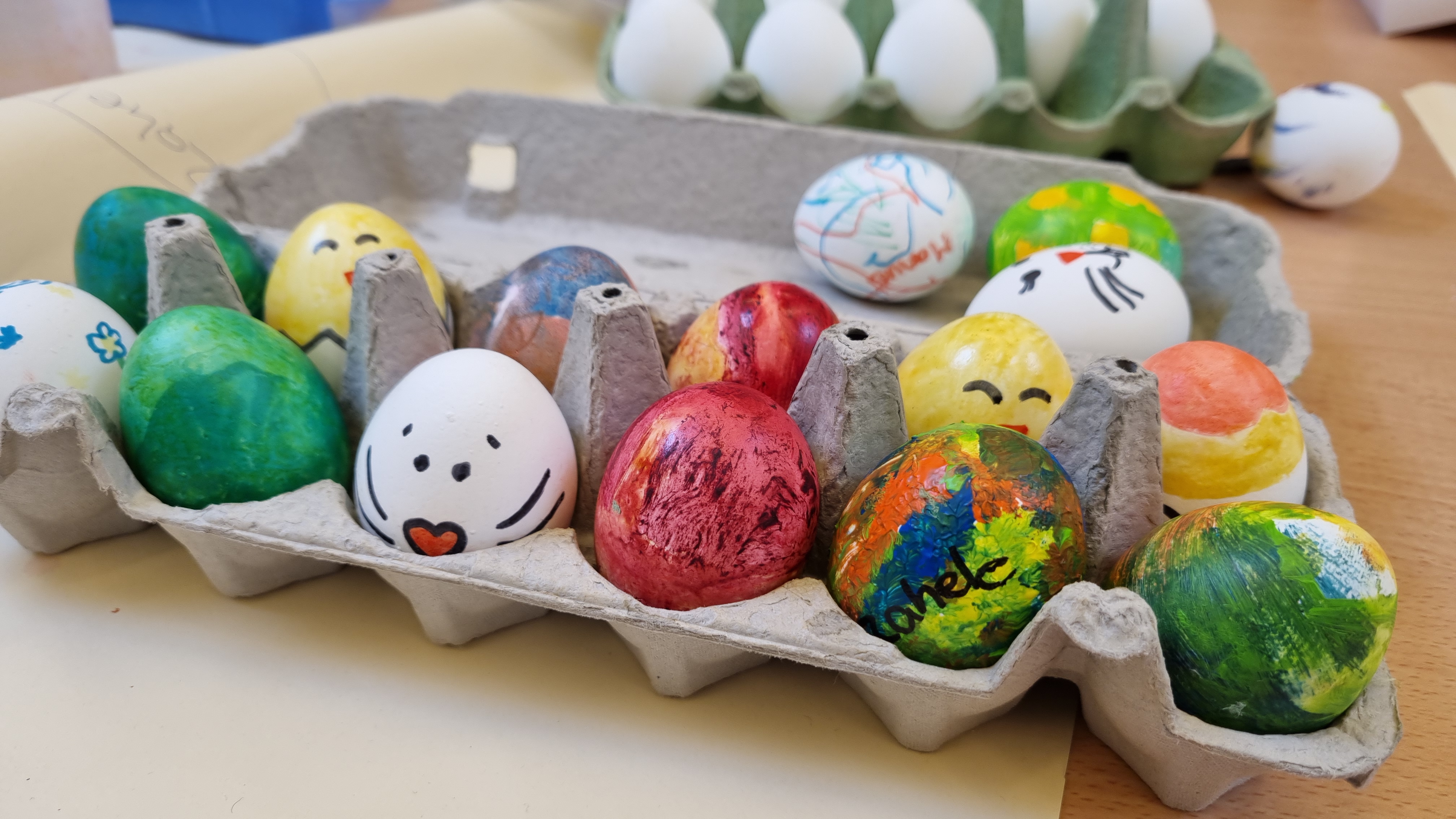 Bereits vor Ostern haben unsere Ateliers mit einer stimmungsvollen Osterwoche für gute Laune gesorgt. Tägliches Musizieren, Singen und Gestalten standen auf dem Programm. Natürlich durften auch das Bemalen und Färben der Eier als feste Ostertradition nicht fehlen. Mit verschiedenen Techniken und Motiven entstand aus jedem Ei ein kleines Unikat.